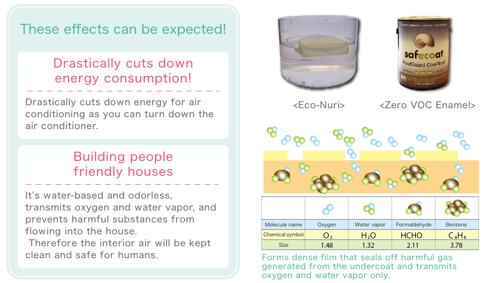 Use “Eco-Nuri,” which contains a lot of air, as heat-insulating foundation, and finish with “Zero VOC Enamel,” which is proven to be effective in air pollution prevention.